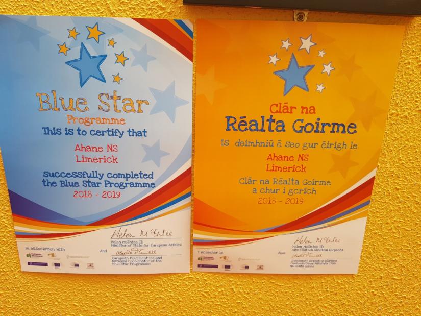 The Blue Star Programme is an education initiative for primary pupils across Ireland. The idea of the Programme is to foster better understanding and knowledge of the European Union and how it affects the lives of Irish citizens among primary pupils through classroom projects and activities. The pupils of Second Class selected different European Countries and completed project work on these countries. The projects were presented to the other children at Assembly in the School Hall.